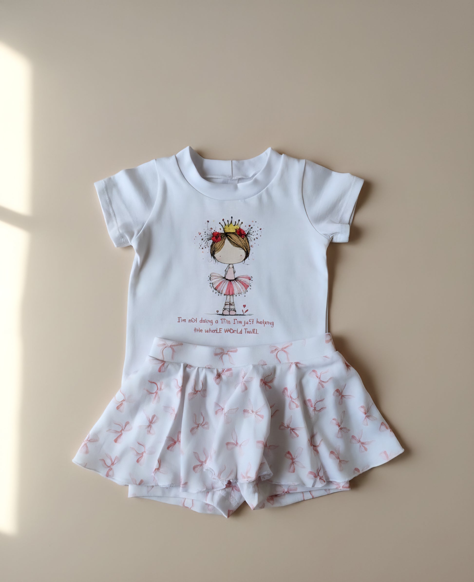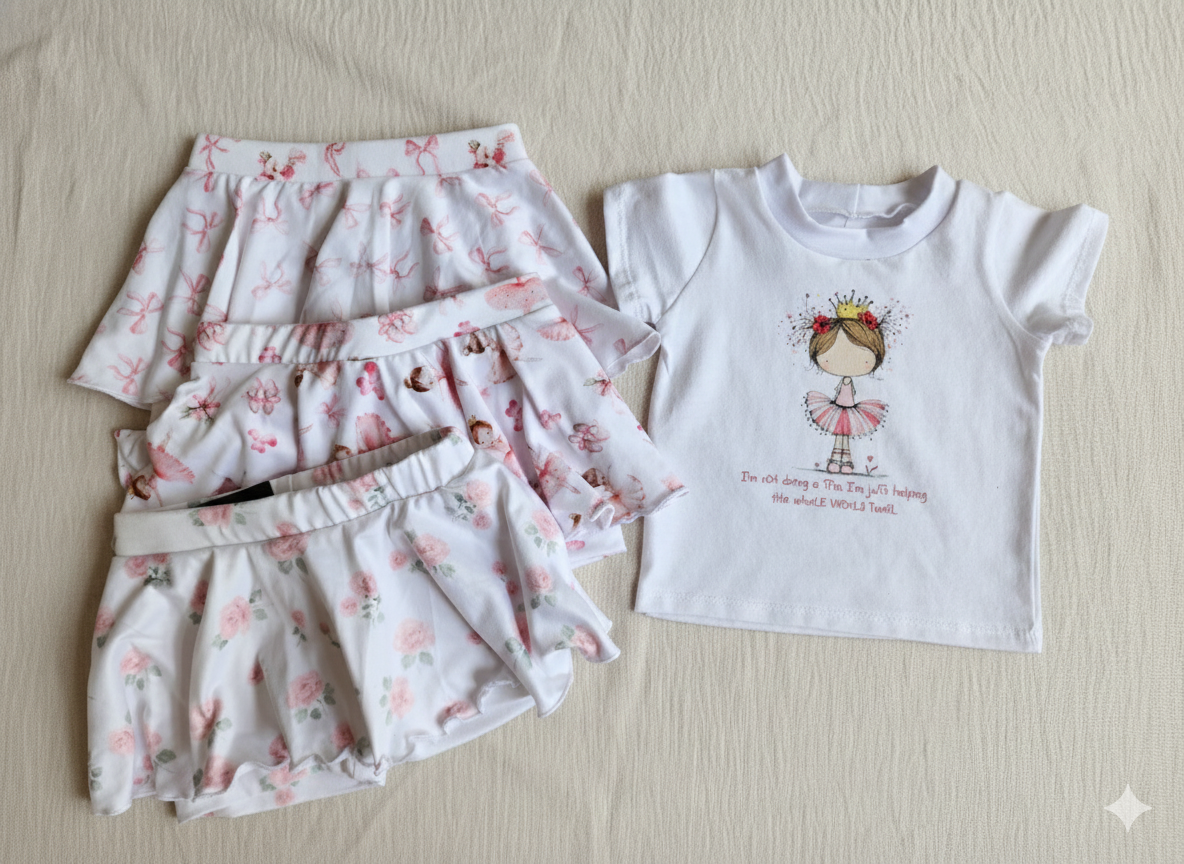Give your little dancer the ultimate blend of style, comfort, and confidence with our charming Ballerina Skorts! These unique pieces feature the sweet, fluttery look of a patterned ballet skirt combined with soft, attached shorts (or tights) underneath.