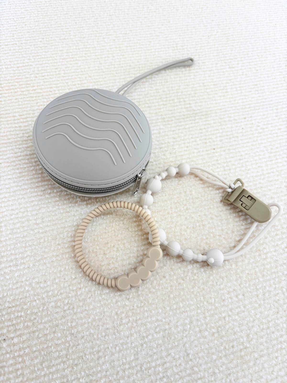 Silicone Pacifier Holder Bag – Convenient and hygienic storage for pacifiers or small teething toys. Easily attaches to your diaper bag or stroller.